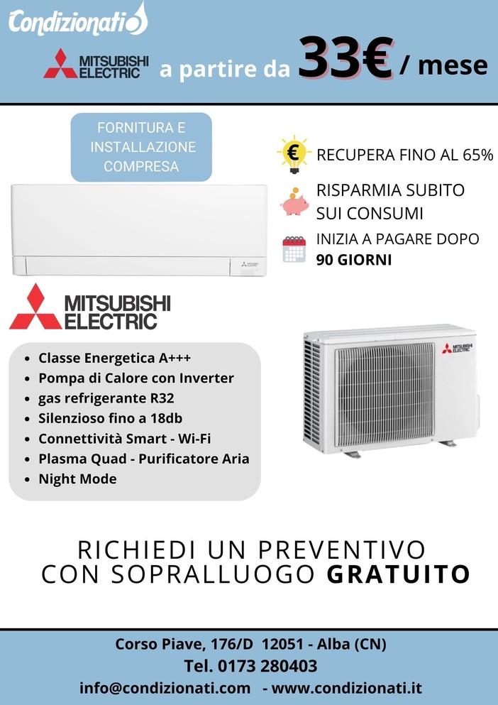 Condizionati, azienda leader nella climatizzazione residenziale e commerciale, propone due offerte imperdibili per l’estate 2025: climatizzatori Daikin e Mitsubishi Electric con installazione inclusa a partire rispettivamente da 35€ e 33€ al mese. Il tutto con detrazioni fiscali fino al 50%, risparmio energetico immediato e possibilità di iniziare a pagare dopo 90 giorni.