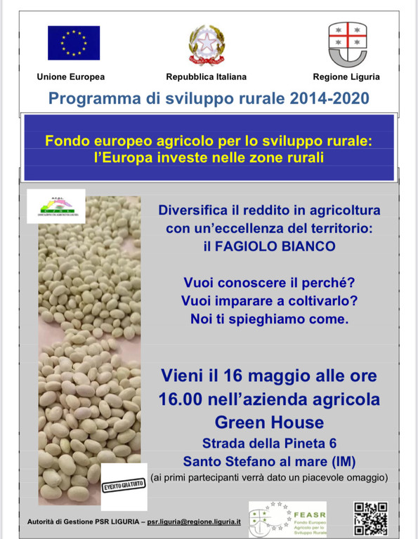 Il progetto sta volgendo al termine. Grazie ai fondi del PSR sono stati condotti gli studi necessari da parte dell'Università di Genova per scoprire di più sulla sua genetica e poter iscrivere i 4 diversi fagioli esaminati presso l'anagrafe nazionale della Biodiversità di interesse agricolo e alimentare. Questo è il primo traguardo per caratterizzare una delle eccellenze del Ponente Ligure che riguarda ad esempio i fagiolo Bianco di Badalucco, Conio e Pigna. Il risultato ottenuto permetterà in futuro di ottenere marchi di riconoscimento che permetteranno un'espansione maggiore del prodotto, oltre che una vittoria per la Biodiversità grazie al fatto che gli esemplari del fagiolo verranno conservati presso un istituto di ricerca scientifica.