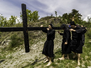 In quel tempo gli abitanti si recavano lassù con alcune croci ed un pesante “Cristo”, poi con una Madonna in marmo pesantissima, sostituita, a partire dall’anno 1841, da un bellissimo gruppo statuario della Madonna della Misericordia, opera dello scultore genovese Paolo Olivari, “commovente ed applaudita dai conoscitori d’arte”, come ebbe a dire il Casalis. Otto persone, dandosi il cambio, si pongono sotto il peso di ben 300 chili, battendo ritmicamente il passo. Oggi non è più così semplice: i portatori sono sempre di meno, ma la presenza di alcuni giovani fa ben sperare; quel che conta è che la pesante statua giunga sul “monte”. Ovviamente ogni aiuto da parte di persone di buona volontà è estremamente gradito. Il “Cristo”, pesante 55 chili, è molto difficile da portare; un solo uomo se lo issa, poggiando i piedi del Signore sulle spalle, ben ritto, sfidando a volte le raffiche di vento. Non si usa nessuna cinghia, come si fa in molti altri luoghi. Il volto si riempie di sudore, ma quel che conta è che il voto venga adempiuto. Che dire poi della nera Croce, che incappucciati in nero, i piedi scalzi, si mettono sulle spalle, in un miracolo di equilibrismo? Non tutti sono capaci, non è sufficiente essere forti e robusti. Naturalmente il popolo seguirà il corteo, cantando e pregando.