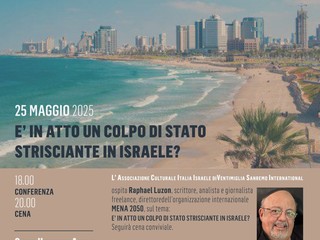 "E' in atto un colpo di stato strisciante in Israele?" sarà il tema al centro della conferenza che verrà proposta il 25 maggio alle 18 presso la sede del sodalizio: il Grand Hotel des Anglais a Sanremo.