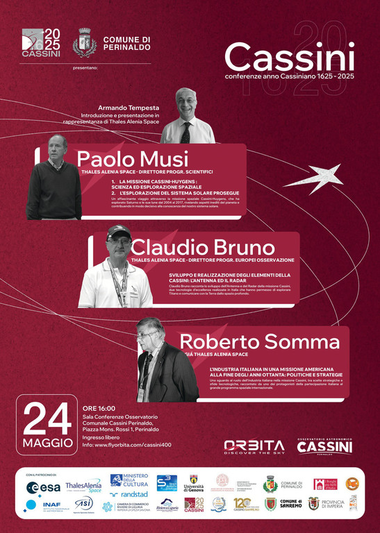 "Interverrà anche Claudio Bruno, direttore dei programmi europei di osservazione di Thales Alenia Space, che si soffermerà sullo 'Sviluppo e realizzazione degli elementi della Cassini: l'antenna e il radar'. Claudio Bruno racconterà lo sviluppo dell'antenna e del radar dalla missione Cassini, due tecnologie d'eccellenza realizzate in Italia che hanno permesso di esplorare Titano e comunicare con la Terra dallo spazio profondo" - svela il primo cittadino - "Infine, vi sarà anche Roberto Somma, già Thales Alenia Space, che illustrerà 'L'industria italiana in una missione americana alla fine degli anni ottanta: politiche e strategie'. Uno sguardo al ruolo dell'industria italiana nella missione Cassini, tra scelte strategiche e sfide tecnologiche, raccontato da uno dei protagonisti della partecipazione italiana al grande programma spaziale internazionale".