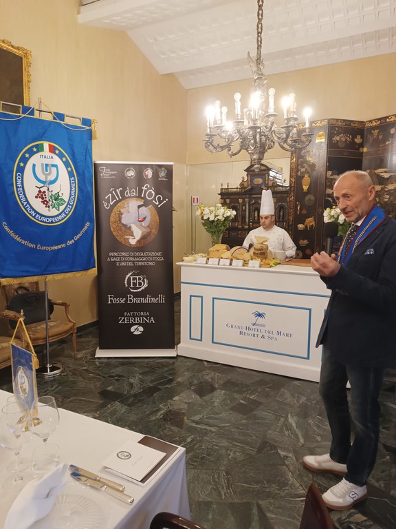 Fedeli custodi delle tradizioni enogastronomiche dei vari territori, i gourmets hanno unito nella cena piatti tipici della cucina territoriale quali il polpo alla ligure, il brandacujun e la sardenaira sanremasca, seguiti da una degustazione di formaggi stagionati nelle antiche fosse malatestiane di Sogliano al Rubicone del socio Marino Brandinelli, nate nel medio evo per permettere alla popolazione la conservazione, principalmente del grano, in previsione di lunghi inverni e di eventuali calamità, carestie e assedi, abbinati ai vini della Fattoria Zerbina di Faenza.