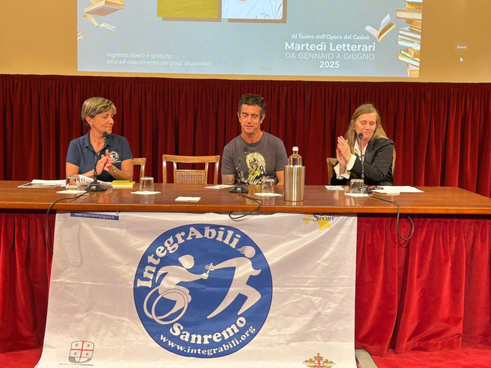 Si è svolto nel pomeriggio di oggi, nel Teatro dell’Opera del Casinò di Sanremo, l’atteso incontro con Vanni Oddera nell’ambito dei Martedì Letterari. L’appuntamento, organizzato in collaborazione con la Polisportiva Dilettantistica Integrabili, ha visto protagonista il celebre freestyler ligure con la presentazione del suo libro “Si cade anche da fermi. Storia di amore e mototerapia” (edito da Ponte alle Grazie). Presenti all'incontro, Alessandra Mamino, presidente della società Integrabili Sanremo, il senatore Gianni Berrino e Sonia Balestra, componente del Cda del Casinò.