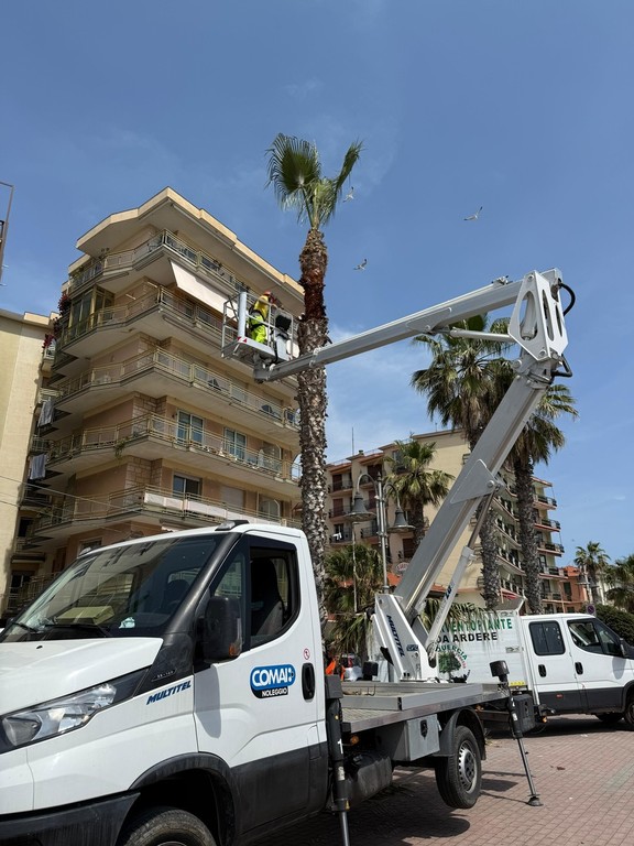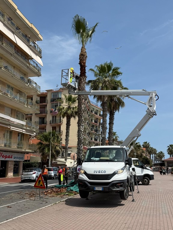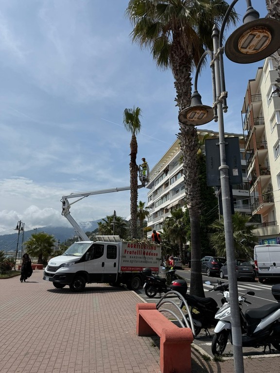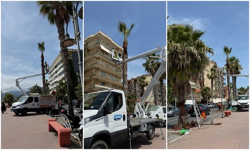 Sono iniziate, oggi, le potature estive a Ventimiglia. Su indicazione dell’assessore Domenico Calimera, le operazioni di 'pulitura' riguardano le palme posizionate sul lungomare.