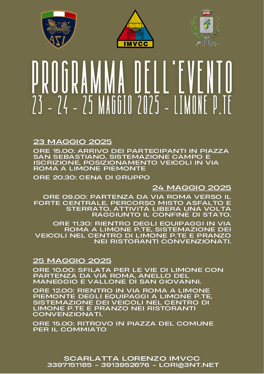 Più di un semplice raduno: sarà una festa per gli appassionati di veicoli storici militari e una vera e propria avventura per i partecipanti che si cimenteranno sui percorsi della strada militare di Limone Piemonte, parte della famosissima Alta Via del Sale. Dal 23 al 25 maggio Limone Piemonte sarà il richiamo di appassionati e collezionisti di veicoli storici militari dove per l’occasione si attendono oltre 50 equipaggi.