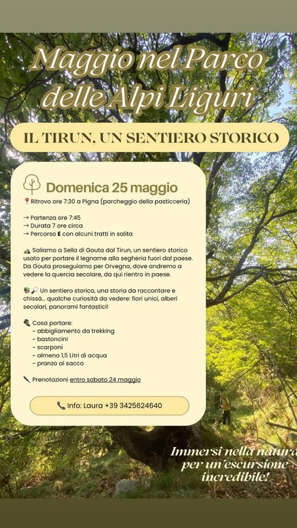 Un'escursione immersa nella natura alla scoperta di un sentiero storico: il Tirun. L'appuntamento, che rientra nelle iniziative di 'Maggio nel parco delle Alpi liguri', sarà domenica 25 maggio.