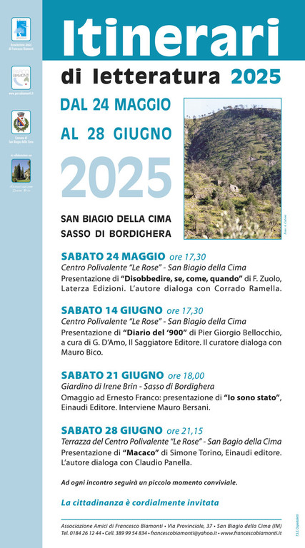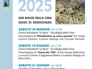A San Biagio della Cima prende il via il ciclo di incontri: "Itinerari di letteratura 2025". Oggi, il 24 maggio, alle 17.30, presso il Centro Polivalente "Le Rose" l'ospite sarà Federico Zuolo, docente di Filosofia politica all'Università di Genova, che parlerà del testo "Disobbedire - Se, come, quando", edizioni Laterza.