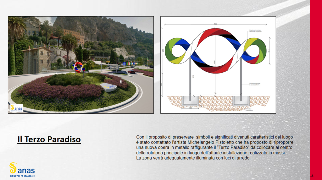 Con il proposito di preservare simboli caratteristici del luogo, è stato contattato l'artista Michelangelo Pistoletto che ha proposto l'installazione di un'opera d'arte in metallo raffigurante il "Terzo Paradiso". "Anas è un'azienda che è su tutto il territorio, comprende 300mila chilometri. Abbiamo da gestire 2057 gallerie. La nostra capacità è quella di riuscire a connettere tantissimi comuni. Abbiamo 8 milioni di passaggi al giorno per un totale di 91 miliardi e mezzo di chilometri percorsi. Una complessità importante che viene gestita dai nostri uomini sul territorio con impegno profondo" - afferma l'amministratore delegato di ANAS S.p.A. Claudio Andrea Gemme - "Il Liguria gestiamo 336 chilometri. Gli impegni economici sono stati 2 miliardi e 420 milioni per manutenzione, nuove opere e progettazione. Il focus sulla progettazione è un focus fondamentale perché ci dà la possibilità diretto".