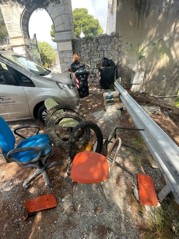 Sedie, gomme, bottiglie, coperture in vetroresina ondulata, tegole e rifiuti di vario genere abbandonati all’entrata del cimitero di Mortola, frazione di Ventimiglia.