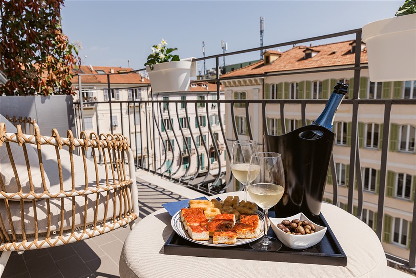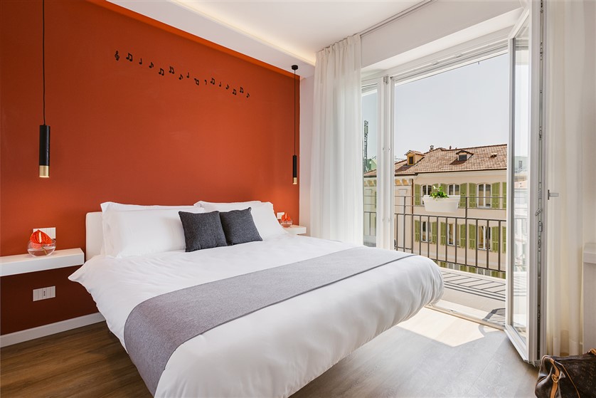 Camera Casinò: con i suoi 26 m², questa raffinata camera doppia può ospitare 2/3 persone ed è dotata di un letto matrimoniale e di un divano letto nel salottino. Il suo terrazzino privato si affaccia su Piazza Borea D’Olmo, creando un’atmosfera intima e accogliente, perfetta per concedersi attimi di relax.