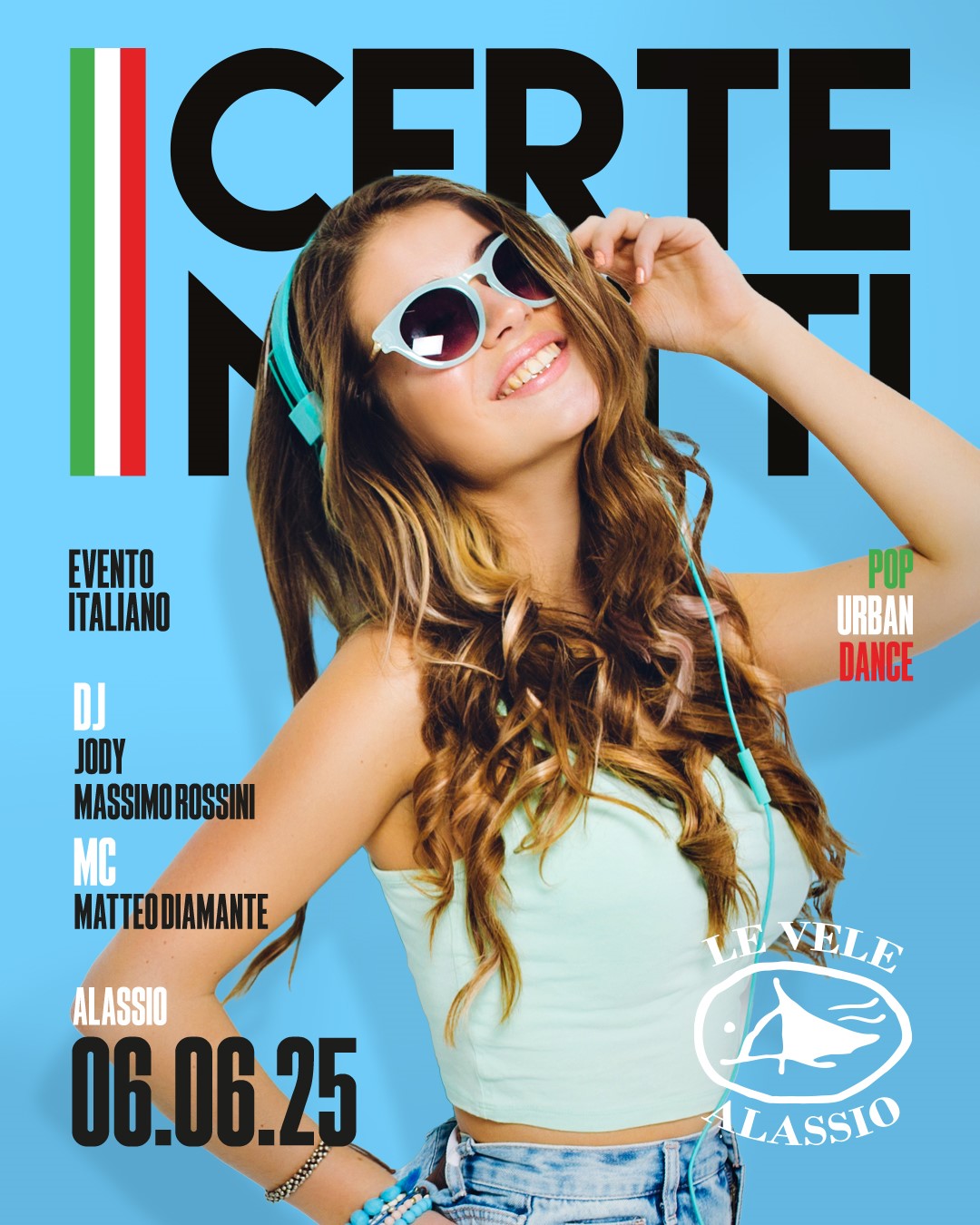 Di ritorno ad Alassio, il weekend si apre con un omaggio tutto italiano: "Certe Notti", il party che celebra le migliori hit del nostro Paese, di ieri e di oggi. Dai classici intramontabili agli ultimi tormentoni, la pista si accenderà a partire dalle 23:00, con un'atmosfera che promette emozioni e cori a squarciagola. Un vero viaggio nella musica che ci unisce, perfetto per chi ama ballare e cantare.