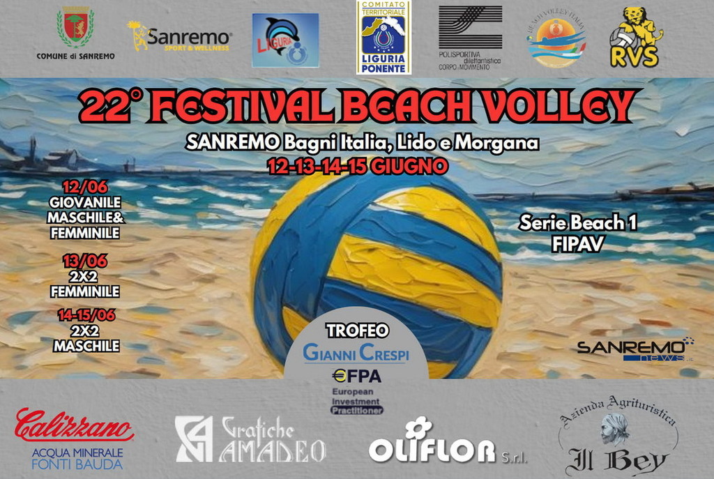 Nel 35° anno della fondazione della Polisportiva Corpo e Movimento Riviera Volley Sanremo, torna il festival del beach volley ‘Trofeo Gianni Crespi’, con la stretta collaborazione dell’Assessorato sport e turismo della cittò dei fiori.