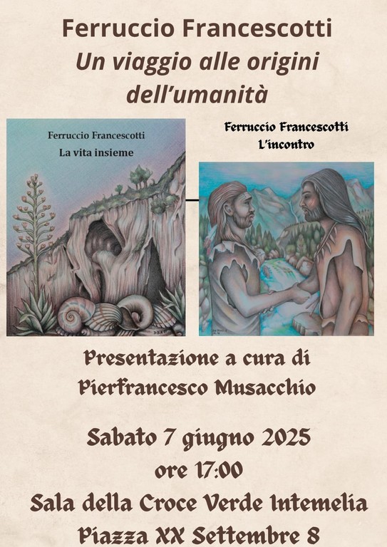 Un viaggio alle origini dell'umanità al centro dell'incontro in programma sabato 7 giugno alle 17 nella sala della Croce Verde Intemelia, in piazza XX Settembre 8, a Ventimiglia. Il professore Pierfrancesco Musacchio, collaboratore vicario dell’Istituto Comprensivo Biancheri e membro del laboratorio di ricerca CEPAM dell’Université Côte d’Azur con alle spalle una solida esperienza accademica e una vasta attività di pubblicazione, offrirà una chiave di lettura scientifica e culturale dell’opera e dialogherà con Ferruccio Francescotti, autore appassionato di astronomia e paleoantropologia, già noto per una serie di pubblicazioni in ambito tecnico e divulgativo, per parlare dei suoi racconti.