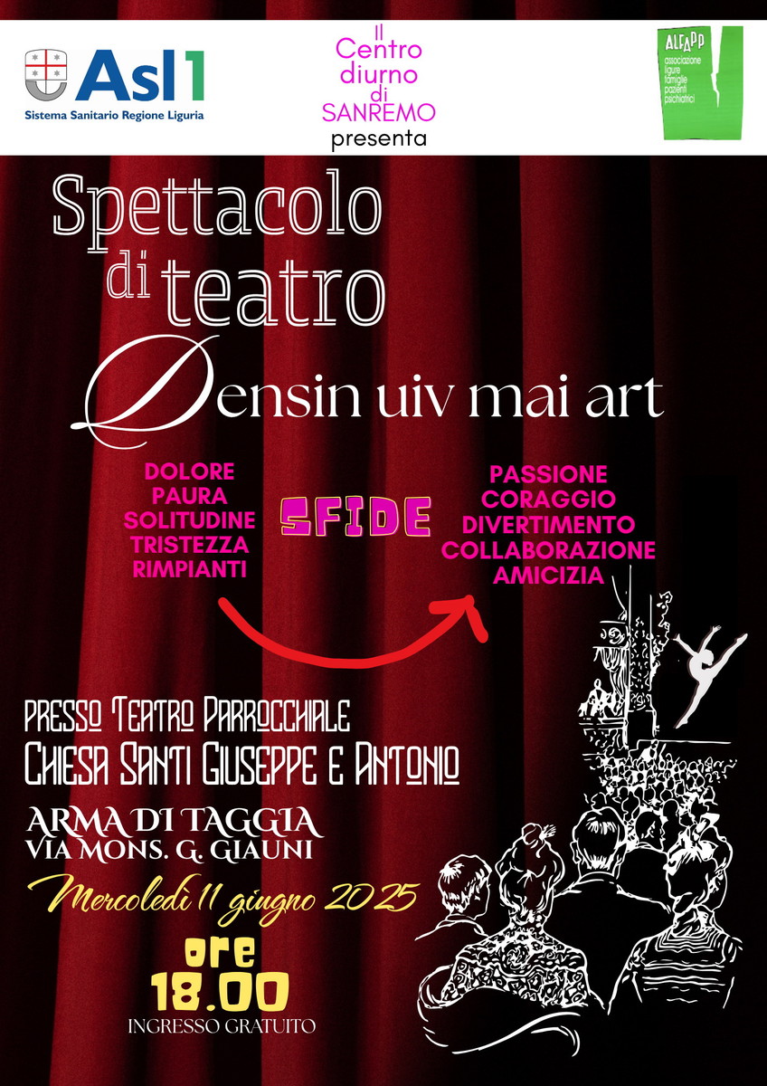 Mercoledì prossimo alle 18, al Teatro Parrocchiale della Chiesa Santi Giuseppe e Antonio di Arma di Taggia (via Mons. G. Giauni), andrà in scena lo spettacolo teatrale “Densin uiv mai art”, esito finale del laboratorio di teatroterapia condotto presso il Centro Diurno di Sanremo, in collaborazione con l’Associazione ALFaPP (Associazione Ligure Famiglie Pazienti Psichiatrici). “Il laboratorio, attivo da circa un anno – spiega il dr. Federico Fortugno, direttore del Centro Salute Mentale e Dipendenze Sanremo - ha coinvolto dieci utenti e operatori del Centro, seguiti da una professionista formata nella conduzione di attività teatrali a mediazione corporea – la dr.ssa Michela Moccafiche - con il supporto dell’intera equipe multidisciplinare.