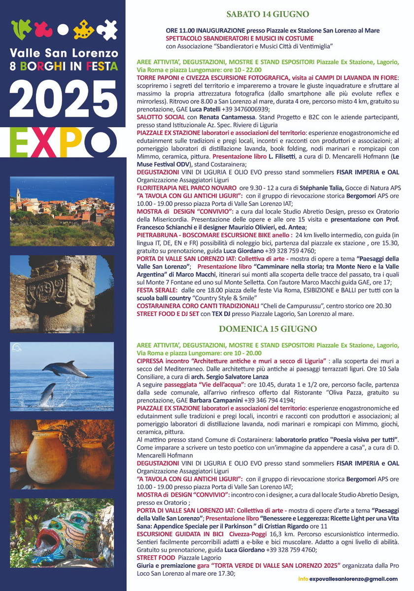 Appuntamento da non perdere, nel fine settimana in arrivo (14-15 giugno), a San Lorenzo al mare, dove va in scena la seconda edizione di Expo Valle San Lorenzo, festosa iniziativa dedicata alle eccellenze del territorio, che coinvolge otto borghi tra costa ed entroterra, tra il blu del mare e il verde della collina. Oltre alla località che accoglie il cuore dell’evento, sono coinvolti i Comuni e le frazioni di Cipressa, Civezza, Costarainera, Pietrabruna, Torre Paponi, Lingueglietta e Boscomare. L’occasione sarà propizia per proseguire – dopo le tappe di Sanremo, Taggia, Diano Marina, Imperia e Pontedassio - le attività legate al progetto “Filiera Locale: insieme per un futuro sostenibile”.