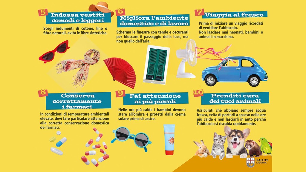Anche quest’anno viene diffuso in tutta la Liguria, attraverso i canali social e locandine, un vademecum con le raccomandazioni da seguire per evitare gli effetti negativi sulla salute delle ondate di calore. I principali comportamenti da adottare per prevenire gli effetti delle ondate di calore sono: idratarsi costantemente durante l’arco della giornata, seguire un'alimentazione leggera, evitare alcolici, bevande gassate e ghiacciate, evitare esposizione al sole specie nelle ore più calde, vestire leggero non usando tessuti sintetici, verificare con il proprio medico eventuale modifica delle terapie, anche in relazione alla pressione sanguigna.