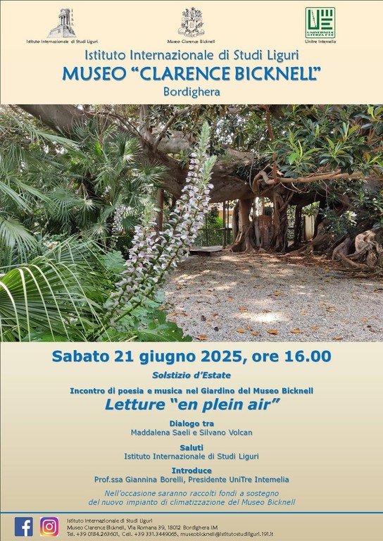 Sabato 21 giugno prossimo, alle ore 16.00, nel Giardino del Museo Clarence Bicknell di Bordighera si festeggerà l’inizio dell’estate con un incontro dedicato alla poesia e alla musica organizzato dall’Istituto Internazionale di Studi Liguri in collaborazione con l’UniTre Intemelia.