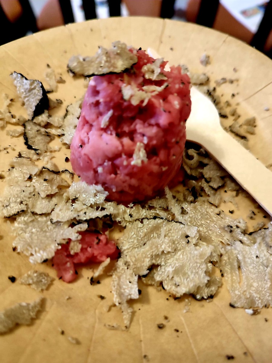Matrimonio perfetto con la battuta al coltello di Razza Piemontese della selezione Autentica di Dario Perucca, emblema di un allevamento etico e sostenibile, che ha regalato al pubblico un momento di pura armonia organolettica. Le note fresche, lievemente erbacee, e la grana tenera e leggermente burrosa dovuta alla battitura manuale della carne, hanno esaltato la profondità terrosa del tartufo.