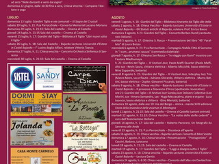 Ancora musica: il 15 discoteca all’aperto, il 16 ‘Concerto di Mezz’estate’ con Simone Alessio, il 24 con Davide Frassoni e Sergio Basilico il ‘Concerto all’alba’ alle 6.30 del mattino. Ancora Bajardo Lectures (9, 23 e 30 agosto); cinema (11, 18 e 24); presentazioni di libri (5 e 7agosto). Il 17 alla Chiesa Vecchia Cassini, Badano e Loiacono ci porteranno il loro ultimo libro ‘Protagoniste’ – Storie di donne e Resistenza nel Ponente Ligure. Nella chiesetta di San Rocco (31 agosto,7 e 14 settembre) ‘Salotto Bosendorfer’ dove davanti ai tasti del nostro storico pianoforte si alterneranno: Giovanni di Martino, Juanita Cazzin, Roberta Genova, Edoardo Lanzi e Sonia Soprano.