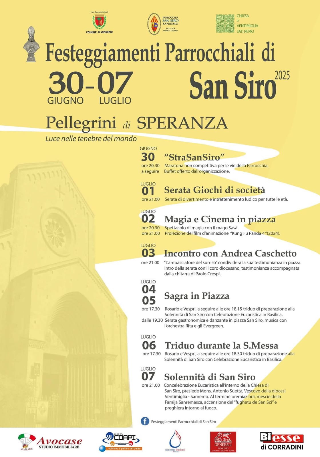 L’estate sanremese entra nel vivo anche grazie ad una settimana ricca di eventi organizzati dal Comitato Festeggiamenti Parrocchiali di San Siro, dal 30 giugno al 7 luglio. Il tema dell’anno 'Pellegrini di Speranza' si incanala nel solco giubilare, tanto caro all’amato Papa Francesco, e vuole presentare una realtà positiva e ottimista. Il 30 giugno si inizia con la consueta 'StraSan Siro' che si snoderà per le strade cittadine con due distinti percorsi: uno accessibile a tutti, da 1 a 99 anni, l’altro più impegnativo, destinato ad atleti esperti; non mancheranno medaglie e coppe per i vincitori.