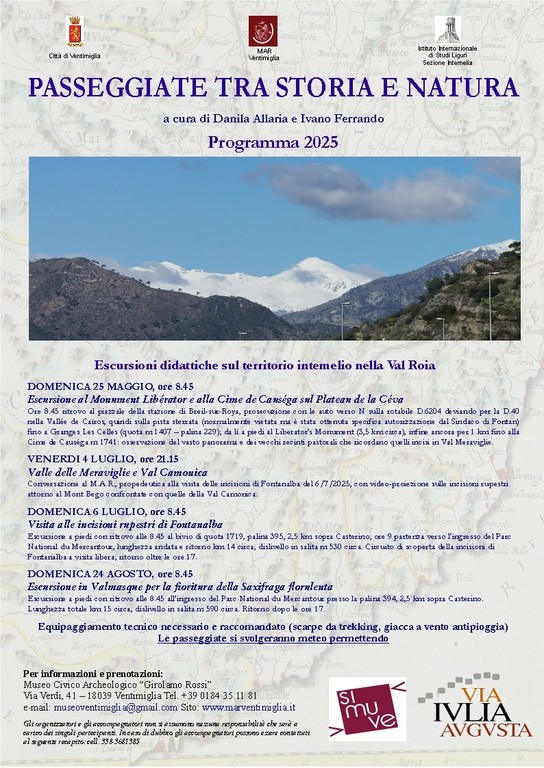 La passeggiata sarà introdotta da un incontro presso il MAR di Ventimiglia venerdì 4 luglio alle ore 21.15 con una conversazione corredata da videoproiezione a cura di Danila Allaria e Ivano Ferrando dedicata al confronto fra le incisioni rupestri della Valle delle Meraviglie con quelle della Valcamonica.