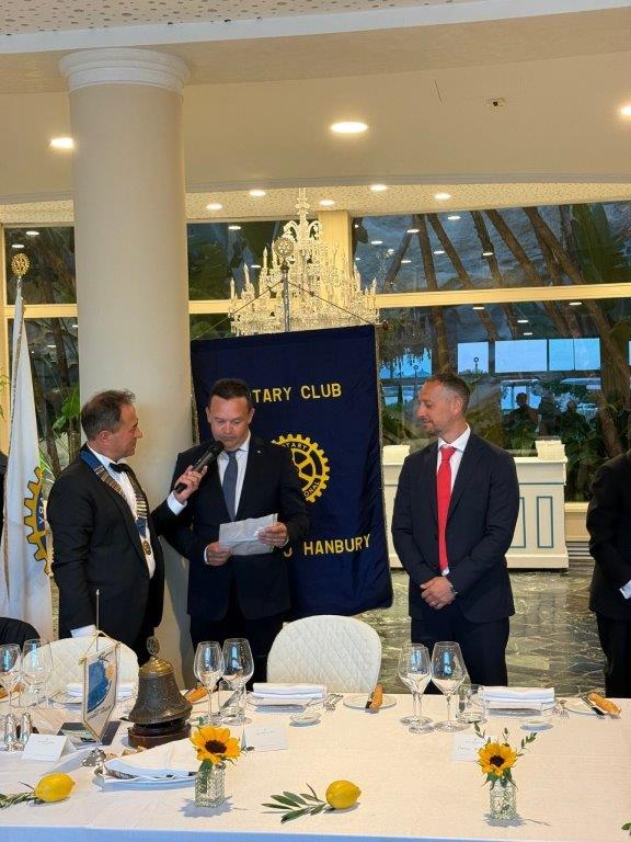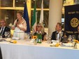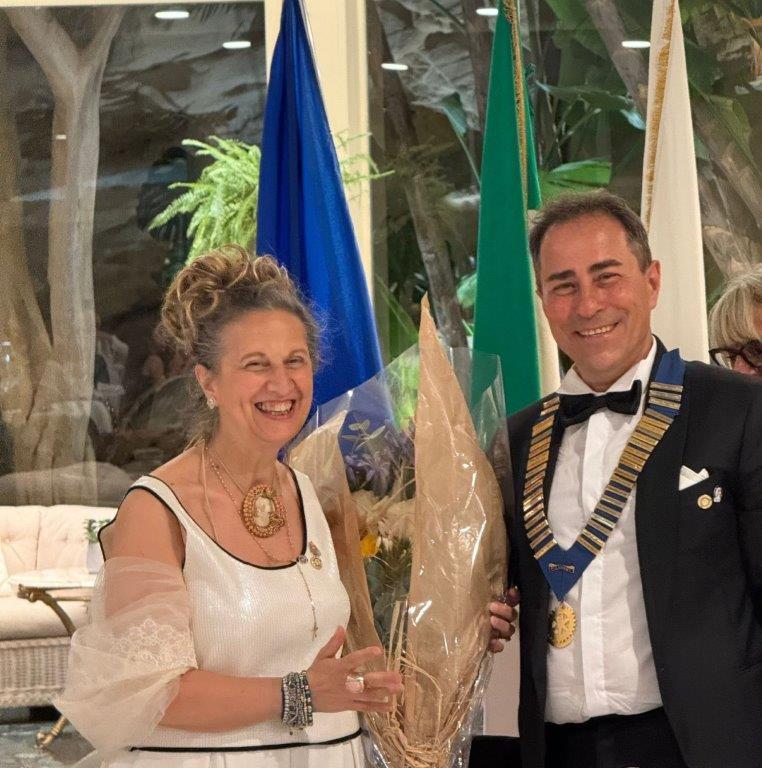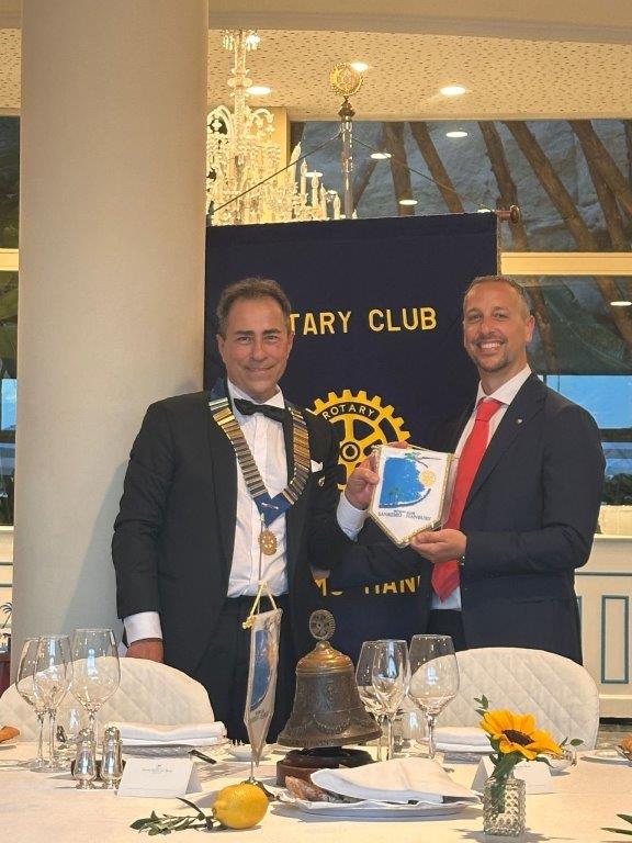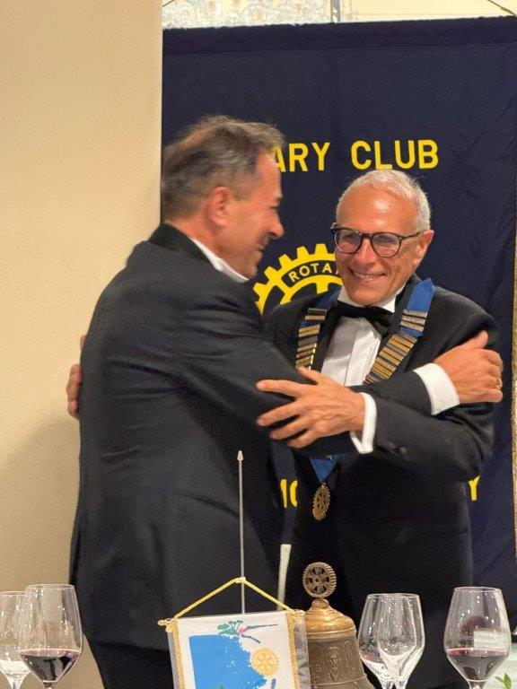 Un sentito grazie e riconoscimento personale del Presidente è andato ai due Presidenti di Commissione del Club molto attivi nel Club: Carmen Lanteri e Paolo Oggero, rispettivamente responsabile della formazione dei soci e coordinatore del Club con il mondo giovanile. Un paio di omaggi floreali all’Assistente del Governatore Raffaella Femia per la vicinanza e supporto continui con il Presidente ed il Club ed a Susanna Bongiovanni Presidente del Rotary Club Lanterna di Genova per l’amicizia costruita nell’anno. A fine serata c’è stato il passaggio del collare tra Sergio Viglietti e il nuovo Presidente Renato Veruggio, suggellato da un abbraccio fraterno, simbolo di amicizia e continuità. Veruggio ha poi presentato le linee guida del suo mandato, improntato a innovazione, azione e amicizia, e ha presentato il nuovo consiglio direttivo.