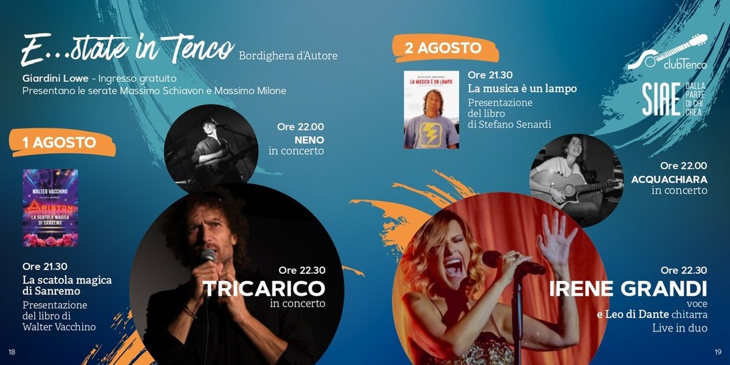 La rassegna musicale, che prevede due serate dedicate alla canzone d'autore italiana, è proposta dall’Amministrazione comunale insieme alla Fondazione Club Tenco. "E…state in Tenco nasce per essere un evento davvero a tutto tondo e per questo sarà occasione anche per apprezzare il talento di Neno e di Acquachiara e per assistere alla presentazione di due libri. E' un investimento che ha un ritorno lentissimo. Non si può pensare e creare una rassegna e avere un ritorno immediato, è un investimento che deve avere una visione e non deve mai lasciarsi andare all'emotività o alla moda del momento" - dice il sindaco Vittorio Ingenito - "E’ un piacere e un onore rinnovare la collaborazione con una realtà prestigiosa come la Fondazione Club Tenco, che anche quest’anno porta a Bordighera due artisti di primo piano. Gli eventi non saranno a pagamento. E' stato preparato un sito, visitbordighera.it, che sarà operativo da oggi pomeriggio, in cui si potrà prenotare la serata. Si potrà, infatti, entrare solamente esibendo il tagliando di prenotazione. Ci sono a disposizione 400 posti a sedere e 100 in piedi. In passato abbiamo avuto degli sponsor, quest'anno no anche per poter avere libera scelta sulla selezione degli artisti. I servizi che diamo ai nostri cittadini sono frutto della tassa di soggiorno. Sono appuntamenti che vengono creati sulla base di un presupposto, un'imposta decisa con il tavolo del turismo".