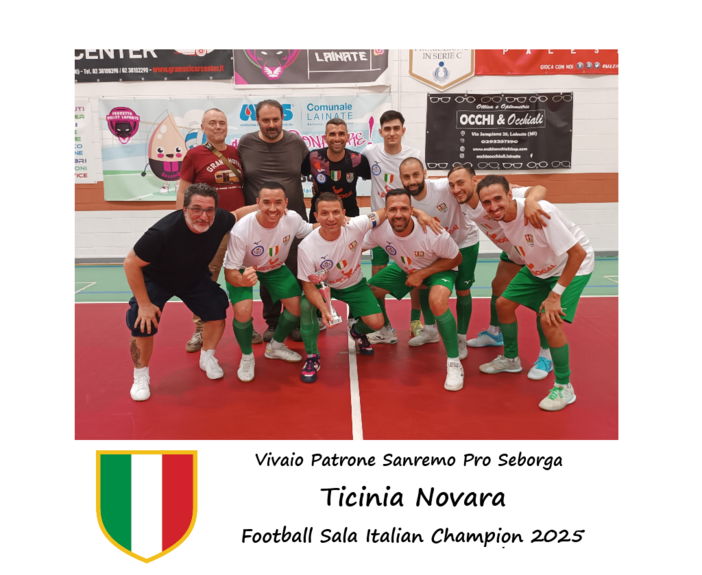 Prosegue a gonfie vele la stagione del Pro Seborga Ticinia Novara nel football sala, il calcio a 5 con le regole originali del Sud America. Dopo il titolo europeo ottenuto conquistando la Champions League disputata 15 giorni fa a Novara, è arrivato infatti anche lo Scudetto al termine del torneo nazionale italiano disputato domenica a Lainate (Milano) con la consueta organizzazione dell FIFS (Federazione Italiana Football Sala). Presso il PalaCairoli 'Silvana Darè', struttura di riferimento della disciplina in Italia, si sono infatti sfidati 6 club in una emozionante Final Six suddivisa in due gironi da tre squadre. Dopo la vittoria sui padroni di casa del Lainate con il risultato di 4-0 i "bi-biancazzurri" (colori sociali che accomunano Pro Seborga e Ticinia Novara) hanno ottenuto il primo posto del proprio girone al termine di una pirotecnica partita vinta 3-2 contro la FIFS Academy, il club formato dai ragazzi delle nazionali giovanili italiane di football sala. La fase finale pomeridiana è stata così contraddistinta da una combinazione davvero unica con la roulette dei ripescaggi che ha messo di fronte al Pro Seborga Ticinia Novara le medesime avversarie del girone mattutino. Dopo aver replicato in semifinale il 4-0 al Lainate, i Campioni d'Europa sono così riusciti a battere nuovamente anche la FIFS Academy al termine di una gara sempre incerta come quella del mattino ma con le squadre molto più chiuse. Il gol scudetto per l'1-0 finale è arrivato infatti a 8 minuti dal termine con Ahmed Hichri a conclusione di una grande azione di squadra. Grande soddisfazione quindi per i due club uniti da questa entusiasmante collaborazione che in 15 giorni ha portato al Vivaio Patrone Sanremo Pro Seborga il primo titolo europeo della sua storia ed ora il primo titolo italiano dopo due semifinali ed un sesto posto ottenuti nelle scorse stagioni sempre nel football sala. Trionfi che invece segnano per il Ticinia Novara la terza vittoria continentale ed il dodicesimo Scudetto FIFS della sua storia gloriosa e leggendaria, un risultato quest'ultimo che permetterà inoltre al sodalizio biancazzurro di rappresentare ancora una volta in Europa, come già quest'anno, la lega italiana della FIFS in Champions League.