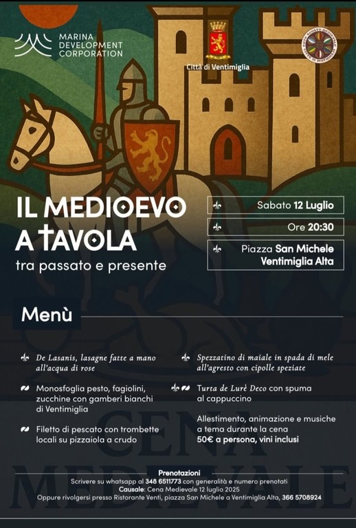 "Per partecipare è necessaria la prenotazione scrivendo su WhatsApp al 3486511773 generalità, numero prenotati e causale 'cena medievale 12 luglio 2025' oppure rivolgersi presso il ristorante Venti in piazza San Michele a Ventimiglia Alta" - dicono gli organizzatori.