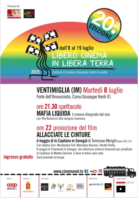 Il Forte dell’Annunziata a Ventimiglia si accende di legalità. La carovana di Cinemovel, Libero cinema in libera terra, che gira l’Italia per rappresentare con strumenti innovativi e coinvolgenti valori essenziali per il nostro territorio come la legalità e l'accoglienza, oggi, martedì 8 luglio, alle 21 presenterà una serata di arte e cinema itinerante.
