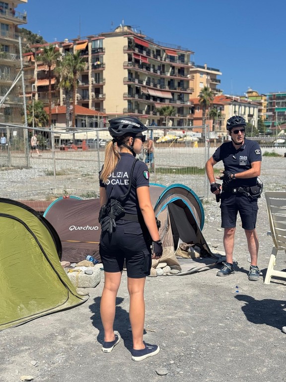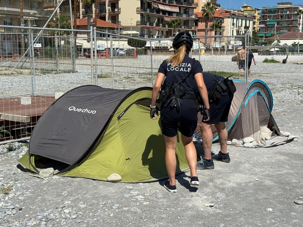 Tende, sdraio e rifiuti. Sono stati trovati e sgomberati dagli agenti della polizia locale in e-bike alcuni accampamenti abusivi presenti in spiaggia nei pressi della foce del fiume Roya a Ventimiglia.