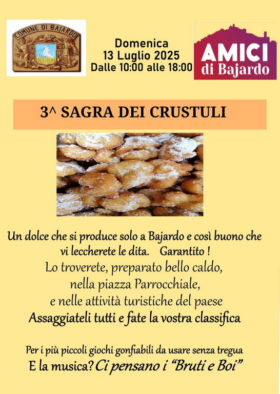 Bajardo festeggia la 3ª edizione della sua amata Sagra dei Crustuli, l’antico dolce tipico della tradizione locale, quest'anno stabilita per domenica 13 luglio 2025, a partire dalle 10:00 fino a sera.