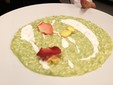 · Risotto mantecato con purea di zucchine trombetta al profumo di Nasturzio, spuma leggera di burrata e petali di Begonia