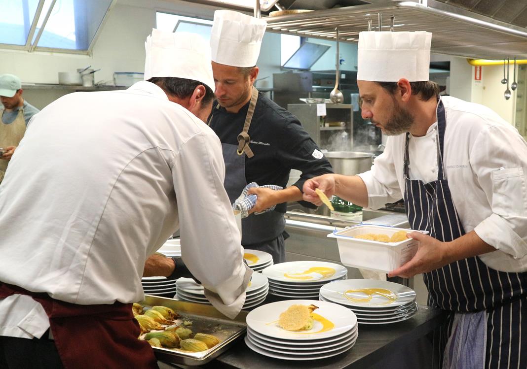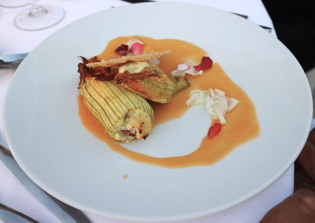 · Fiori di zucca farciti con ricotta e maggiorana, accompagnati da petali di Bocca di Leone, cremoso al datterino giallo e cialda croccante di Parmigiano Reggiano