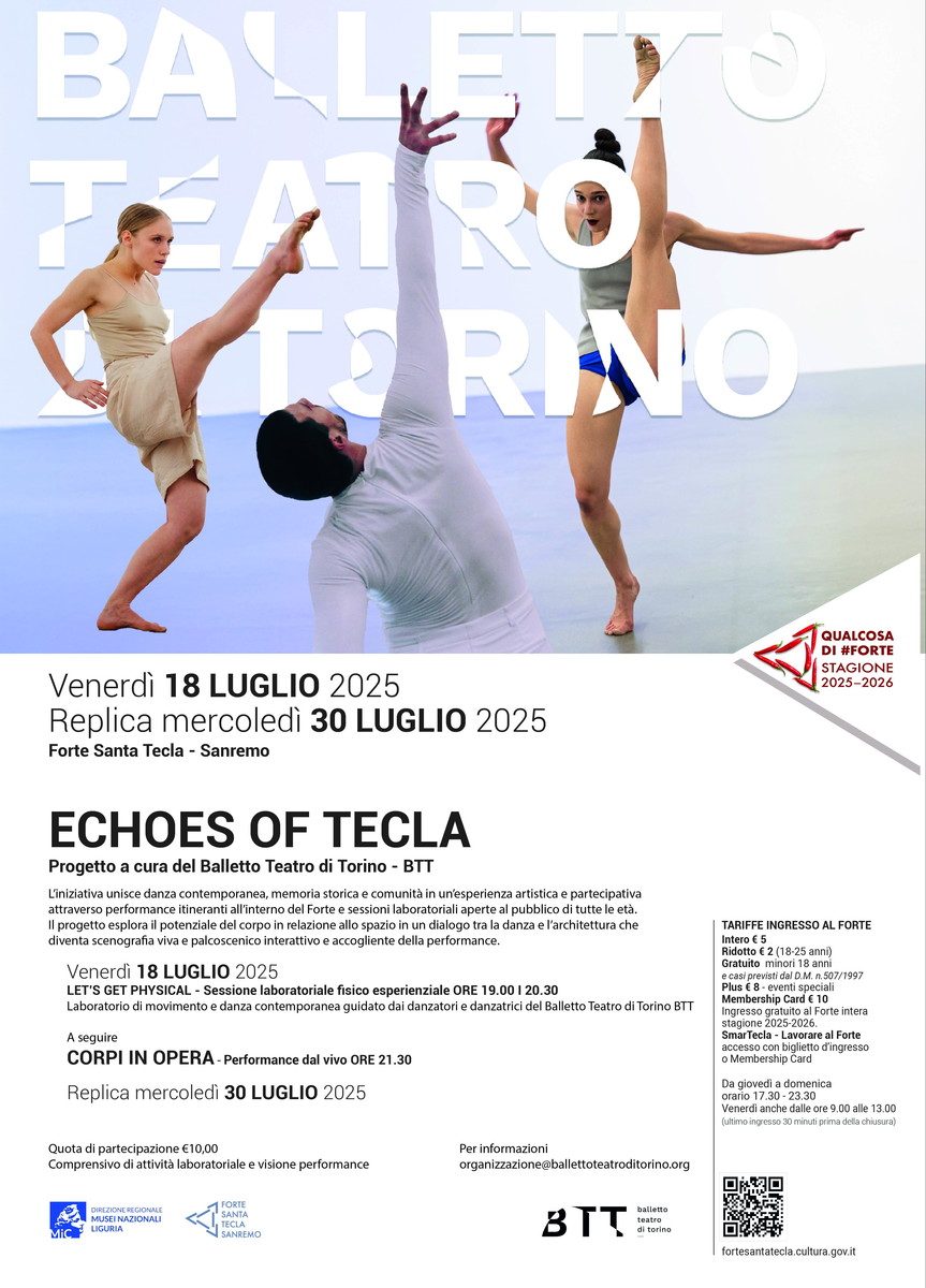 Al Forte Santa Tecla di Sanremo appuntamento con la danza contemporanea. Venerdì prossimo e in replica mercoledì 30 luglio, due grandi serate dedicate alla danza e all’arte con 'Echoes of Tecla', prodotto da Balletto Teatro di Torino. Il progetto unisce la danza contemporanea, memoria storica e comunità in un'esperienza artistica e partecipativa attraverso performance itineranti e sessioni di laboratori aperti al pubblico dove la suggestiva cornice del Forte diventa scenografia vivente e palcoscenico interattivo. Sotto il programma.