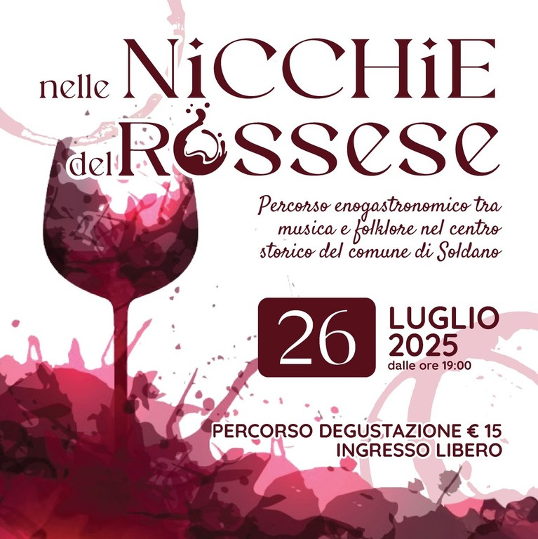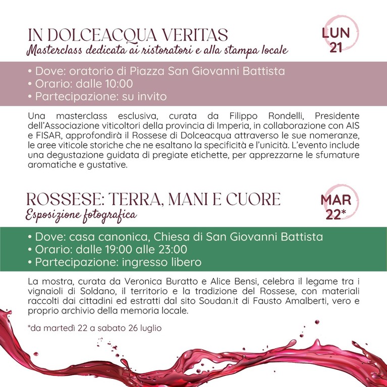 La manifestazione si svolgerà con il patrocinio del comune di Soldano, il contributo della Confederazione Italiana Agricoltori e di Coldiretti e la collaborazione di AIS (Associazione Italiana Sommelier), FISAR (Federazione Italiana Sommelier Albergatori e Ristoratori) e ONAV (Organizzazione Nazionale Assaggiatori di Vino). "Lunedì 21 andrà in scena 'In Dolceacqua veritas', una masterclass esclusiva, curata da Filippo Rondelli, presidente dell'associazione viticoltori della provincia di Imperia, in collaborazione con Ais e Fisar, che approfondirà il Rossese di Dolceacqua attraverso le sue nomeranze, le aree viticole storiche che ne esaltano la specificità e l'unicità. L'evento include una degustazione guidata di pregiate etichette per apprezzarne le sfumature aromatiche e gustative. E' dedicata ai ristoratori e alla stampa locale su invito presso l'oratorio di piazza San Giovanni Battista dalle 10. Martedì 22 luglio verrà proposta un'esposizione fotografica dal titolo 'Rossese: terra, mani e cuore' nella chiesa di San Giovanni Battista dalle 19 alle 23. Celebra il legame tra i vignaioli di Soldano, il territorio e la tradizione del Rossese con materiali raccolti dai cittadini ed estratti dal sito Soudan.it di Fausto Amalberti, vero e proprio archivio della memoria locale. L'ingresso della mostra, curata da Veronica Buratto e Alice Bensi, è libero" - fanno sapere gli organizzatori - "Giovedì 24 si terrà 'Eros e vino', una degustazione guidata aperta al pubblico presso la sala consiliare dalle 21. Un viaggio sensoriale raffinato tra vino ed Eros con Giovanni Revello e la dottoressa Patrizia Sciolla, sessuologa, esplorando simboli, aromi e desideri in un'esperienza che coinvolge corpo e mente intrecciando sapori e sensazioni. La partecipazione è su prenotazione al 3384715723".