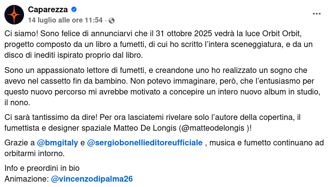 Il post con cui Caparezza ha comunicato la notizia dell’uscita di “Orbit Orbit”