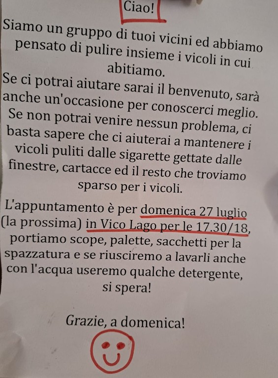Un'iniziativa aggregativa e di senso civico. "L'appuntamento è per domenica 27 luglio in vico Lago per le 17.30/18" - dicono - "Portiamo scope, palette, sacchetti per la spazzatura e se riusciremo a lavarli anche con l'acqua useremo qualche detergente, si spera. Grazie a domenica".