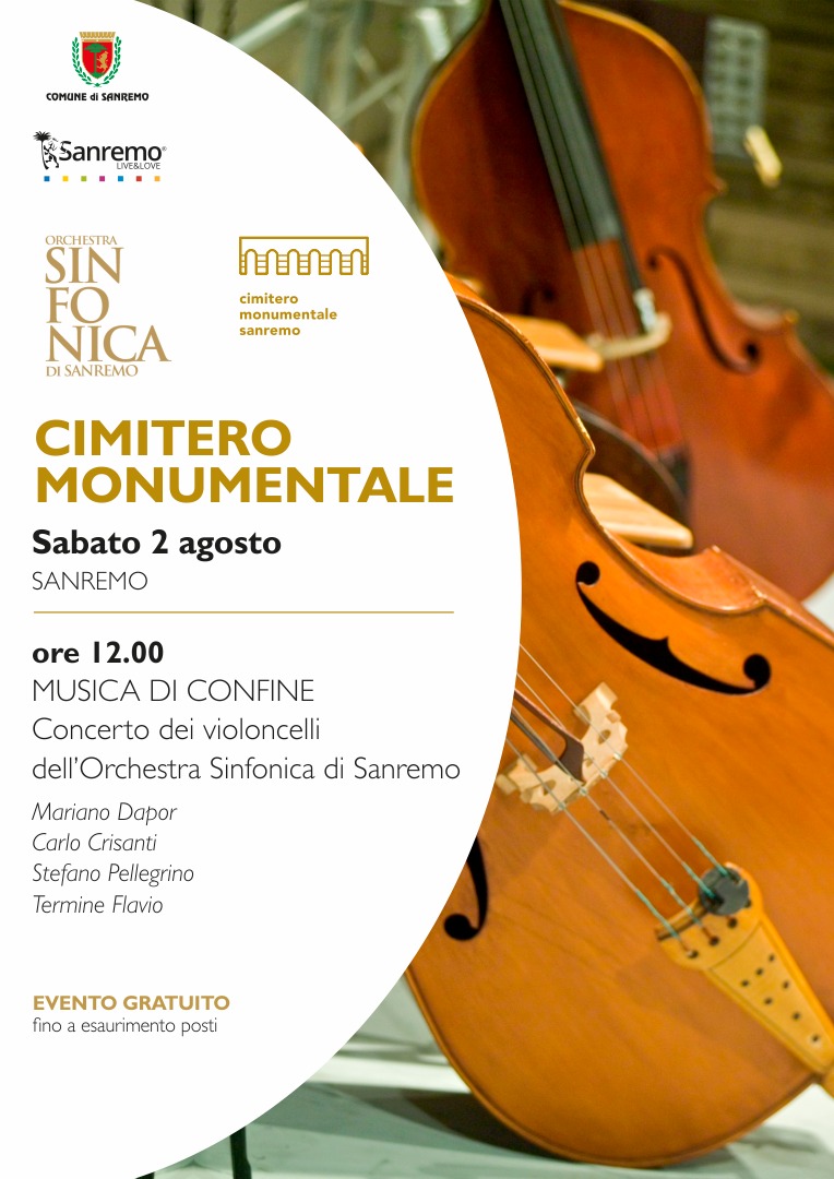 Domani, sabato 2 agosto alle ore 12, il silenzio solenne del Cimitero Monumentale della Foce sarà attraversato dalle note vibranti del Quartetto di violoncelli dell'Orchestra Sinfonica di Sanremo. L'appuntamento musicale, ad ingresso gratuito fino a esaurimento posti, è parte del programma culturale cittadino e propone un’esperienza sonora intima e riflessiva: il concerto “Musica di confine”.
