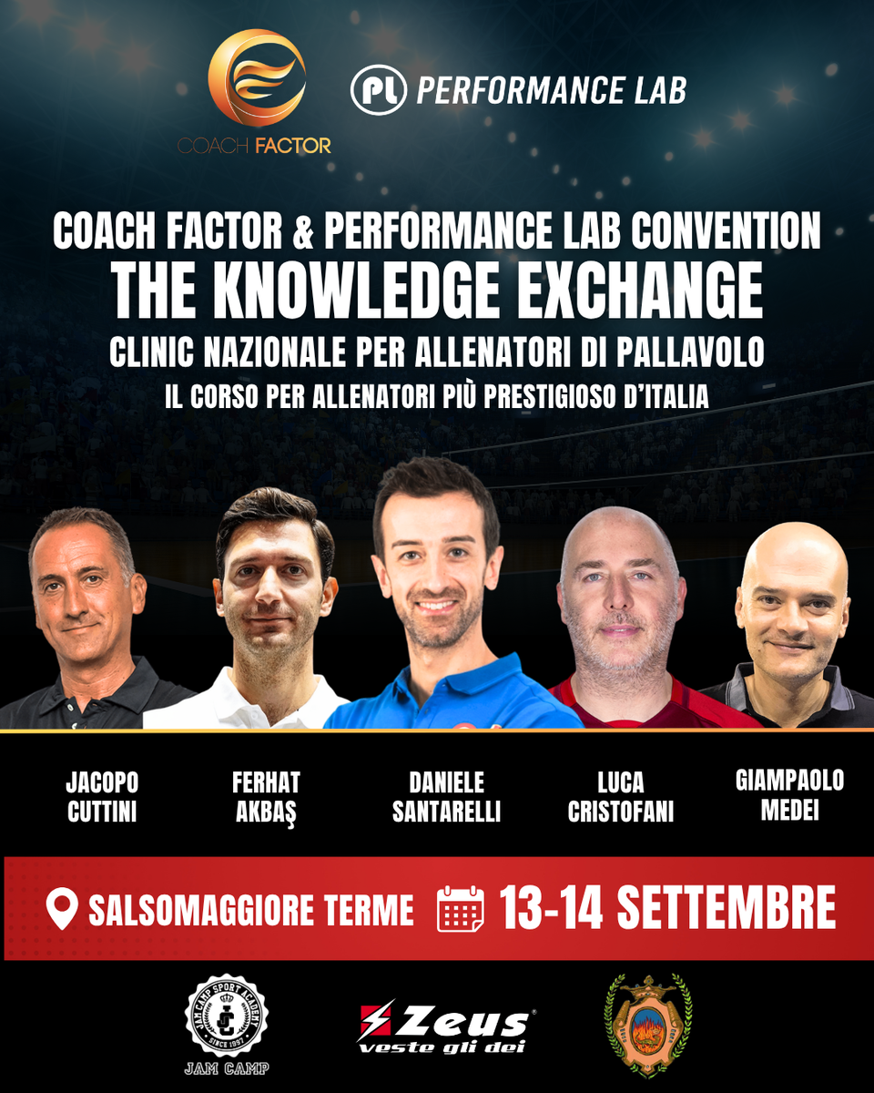 Un’occasione unica per tutti gli allenatori, preparatori fisici e appassionati di pallavolo: il 13 e 14 settembre si svolgerà a Salsomaggiore Terme la Coach Factor & Performance Lab Convention – The Knowledge Exchange, un evento formativo di altissimo livello, pensato per chi vuole crescere, confrontarsi e imparare dai migliori professionisti del volley nazionale e internazionale.