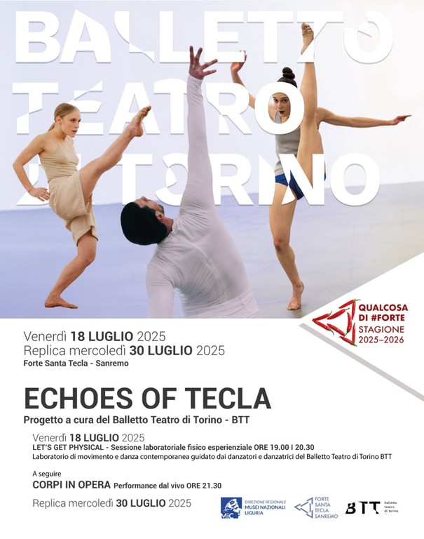 Echoes of Tecla, la serata dedicata alla danza contemporanea firmata dal BTT- Balletto Teatro di Torino, è stata presentata per la seconda volta mercoledì 30 luglio nel Forte di Santa Tecla a Sanremo. Il programma tripartito dal titolo progettuale Corpi in opera ha regalato a un pubblico vigile e incuriosito tre assoli: ognuno danzato e costruito ad hoc da un interprete e un coreografo diverso; mettendo così in scena, non solo tre proposte coreografiche, cariche ognuna di una personale identità ma anche tre modi di interrogarsi sulla relazione che si instaura tra autore e danzatore nel momento della creazione artistica.