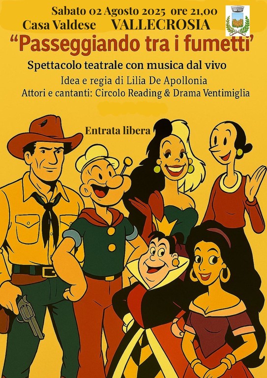 "Il gruppo reciterà monologhi e dialoghi ispirati a iconici personaggi dei cartoon, come Tex che si racconta emozionando i suoi lettori, la regina di Cuori, cattiva da Carroll a Disney, o ancora Braccio di ferro e i suoi amici, con Olivia, o Esmeralda di Notre Dame de Paris o Crudelia, altra eroina perfida, Mafalda, cartoon femminista e tanti altri. Un quadro grande, formato dal maestro Fabio Berro, sarà il suggestivo fondale" - fa sapere Lilia De Apollonia - "Lo sfondo sarà il parco con alberi secolari che una lady britannica donò a fine ottocento alla comunità, da poco costituitasi, dei valdesi di Vallecrosia".