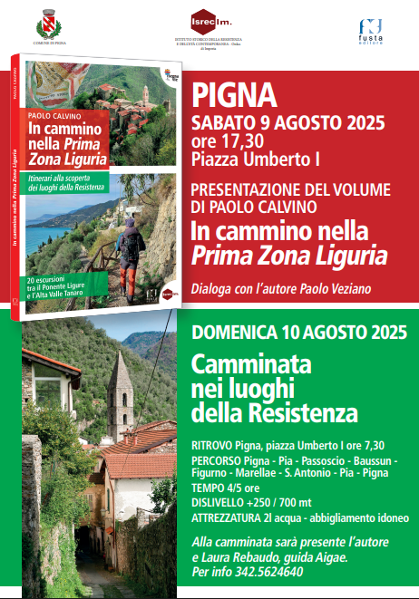 Due appuntamenti, nel prossimo fine settimana, a Pigna. Sabato 9 agosto alle 17.30 in piazza Umberto I vi sarà la presentazione del volume “In cammino nella prima zona Liguria” di Paolo Calvino. A dialogare con l’autore vi sarà Paolo Veziano.