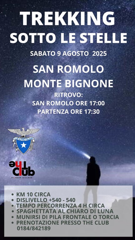 Sabato 9 agosto, in collaborazione con la palestra The Club, il CAI, sezione di Sanremo, propone una salita serale a Monte Bignone da San Romolo, con spaghettata al chiaro di luna e osservazione delle stelle mediante un binocolo astronomico.