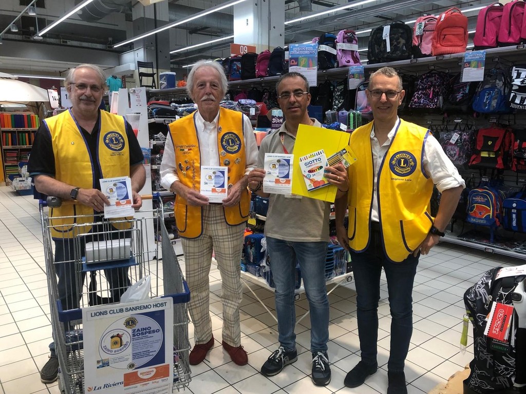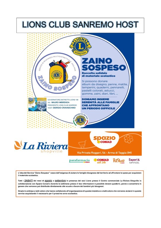 Il Lion Sanremo Host in collaborazione con Spazio Conad, presso il Centro commerciale di Arma di Taggia La Riviera Shopville, ha iniziato con estremo successo nell’intera giornata di ieri il Service "Zaino Sospeso" una raccolta di cancelleria e non solo, nata dall’esigenza di aiutare le famiglie bisognose del territorio ad affrontare in un momento storico di grandi difficoltà economiche, le spese per acquistare il materiale scolastico.