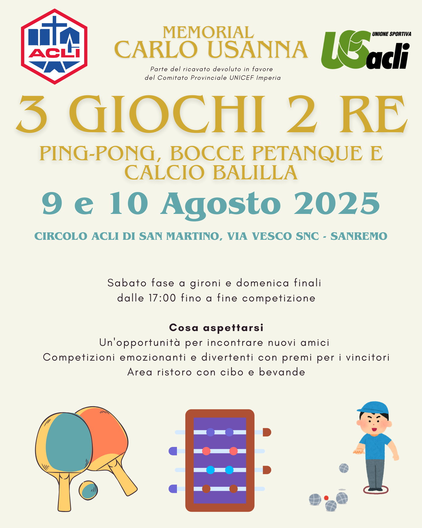 Un weekend di sport, amicizia e solidarietà in cui i partecipanti si sfideranno in tre discipline amatissime: ping-pong, bocce petanque e calcio balilla. Un’occasione per ricordare con affetto Carlo Usanna, figura di riferimento per la comunità locale e per lo sport popolare.