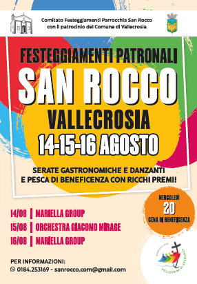 Tornerà anche l'atteso e tradizionale festino organizzato dal Comitato Festeggiamenti di San Rocco con il patrocinio del comune di Vallecrosia nella parrocchia di San Rocco per celebrare il Ferragosto e il santo patrono della città della famiglia. Le serate gastronomiche e danzanti con pesca di beneficenza saranno il 14, il 15 e il 16 agosto dalle 19.30. "Il 14 e il 16 agosto vi sarà Mariella Group mentre il 15 agosto l'Orchestra Giacomo Mirage. Il ricavato del festino verrà devoluto alla parrocchia e quest'anno sarà destinato per il fotovoltaico. Vogliamo fare un passo avanti importante: l'intenzione è di iniziare quanto prima a lavorare con il fotovoltaico" - svela don Rito - "Mercoledì 20 agosto, invece, verrà organizzata una cena di beneficenza".