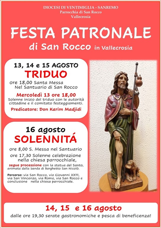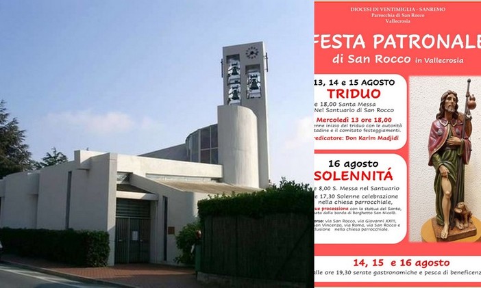 "In preparazione alla festa patronale di San Rocco, un momento tanto atteso sia dai cittadini che dai turisti, il 13, il 14 e il 15 agosto verrà celebrata alle 18 la santa messa nel santuario di San Rocco" - fa sapere don Rito, parroco della parrocchia di San Rocco a Vallecrosia - "Il 13 agosto alle 18 vi sarà il solenne inizio del triduo con le autorità cittadine e il comitato dei festeggiamenti. Per l'occasione il predicatore sarà don Karim Madjidi, parroco della parrocchia di Maria Ausiliatrice".