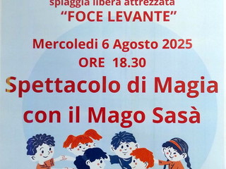 Un pomeriggio di divertimento e magia attende bambini e famiglie a Sanremo. Mercoledì 6 agosto, alle 18.30, la spiaggia libera attrezzata "Foce Levante", gestita dal Comitato di Sanremo della Croce Rossa Italiana, ospiterà lo "Spettacolo di Magia con il Mago Sasà". L'iniziativa, a ingresso gratuito, è pensata per offrire un momento di svago e allegria a tutti i bagnanti e ai residenti della zona. Un'occasione per trascorrere un'ora diversa all'insegna della spensieratezza e della meraviglia, in una delle cornici più suggestive della città.