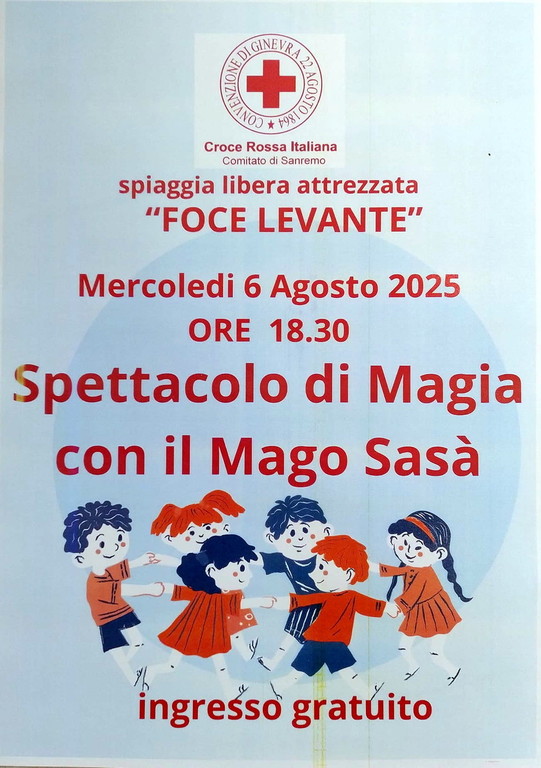 Un pomeriggio di divertimento e magia attende bambini e famiglie a Sanremo. Mercoledì 6 agosto, alle 18.30, la spiaggia libera attrezzata "Foce Levante", gestita dal Comitato di Sanremo della Croce Rossa Italiana, ospiterà lo "Spettacolo di Magia con il Mago Sasà". L'iniziativa, a ingresso gratuito, è pensata per offrire un momento di svago e allegria a tutti i bagnanti e ai residenti della zona. Un'occasione per trascorrere un'ora diversa all'insegna della spensieratezza e della meraviglia, in una delle cornici più suggestive della città.